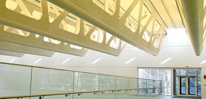 A $38.6 million extension to the existing Recreation Centre, the Guildford Aquatic Centre stands at 70,000 sqft, with a clear span roof comprised of 22 innovative custom trusses made of LSL (Laminated Stranded Lumber) and Glulam top and bottom chords. The trusses contain a built-in maintenance catwalk hidden from view and contains the MEP (Mechanical, Electrical, & Pluming) services such as, fire sprinklers, lighting, and ducting.