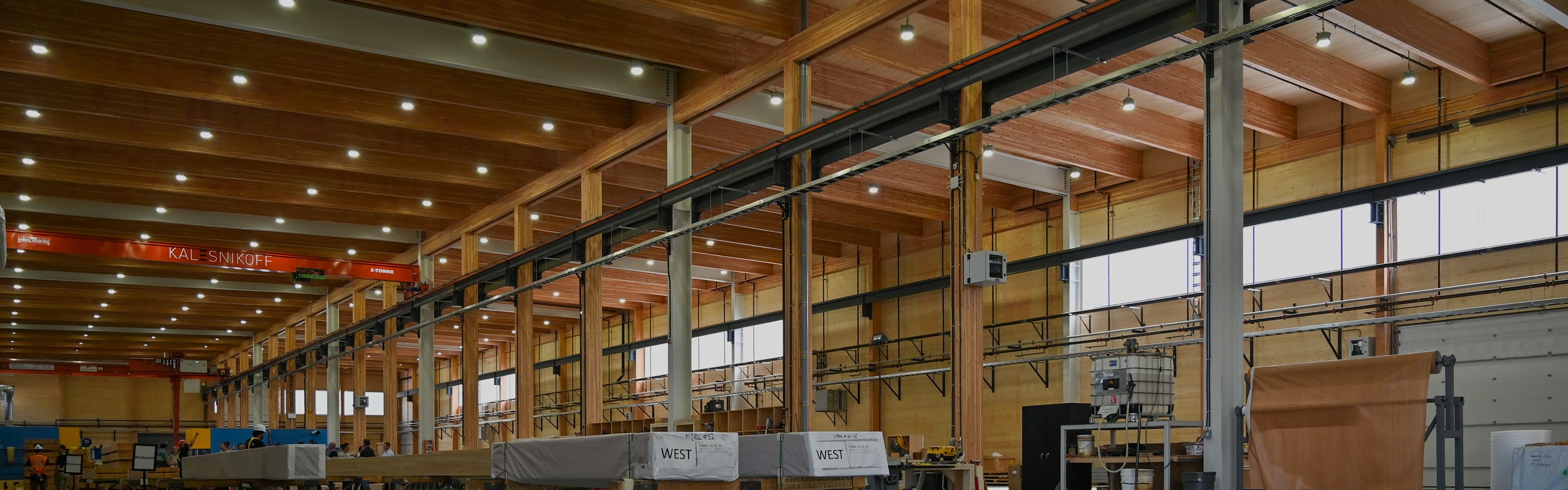 The structure combines a glulam post-and-beam frame with CLT wall panels, GLT roof elements, and selective steel moment frames to support large, open production bays. A steel-and-timber canopy wraps the perimeter, providing both weather protection and lateral support for the timber-slat exterior walls. This hybrid system offers the strength and flexibility needed for handling oversized modules, heavy rigging loads, and high clearances required for fabrication equipment.