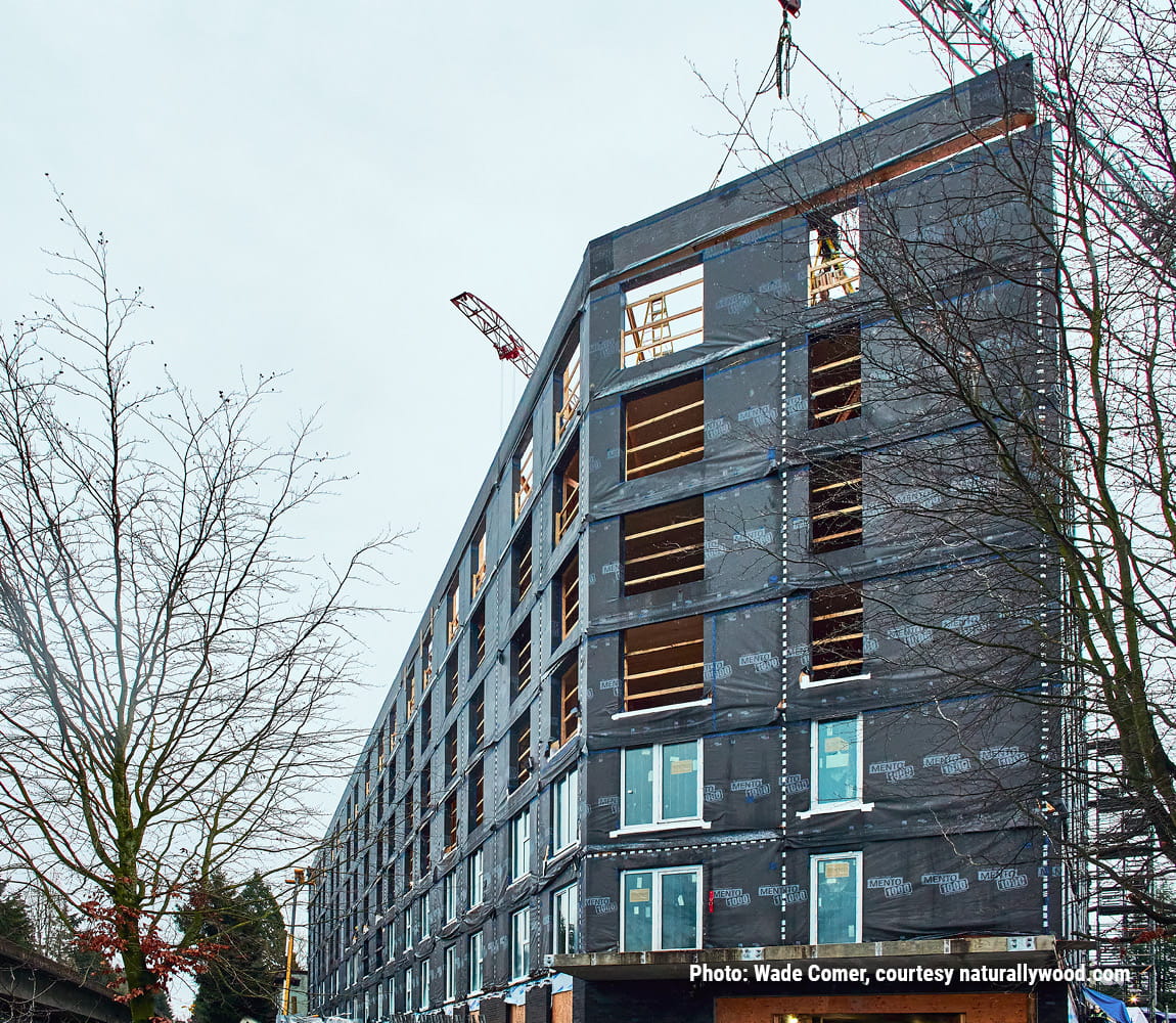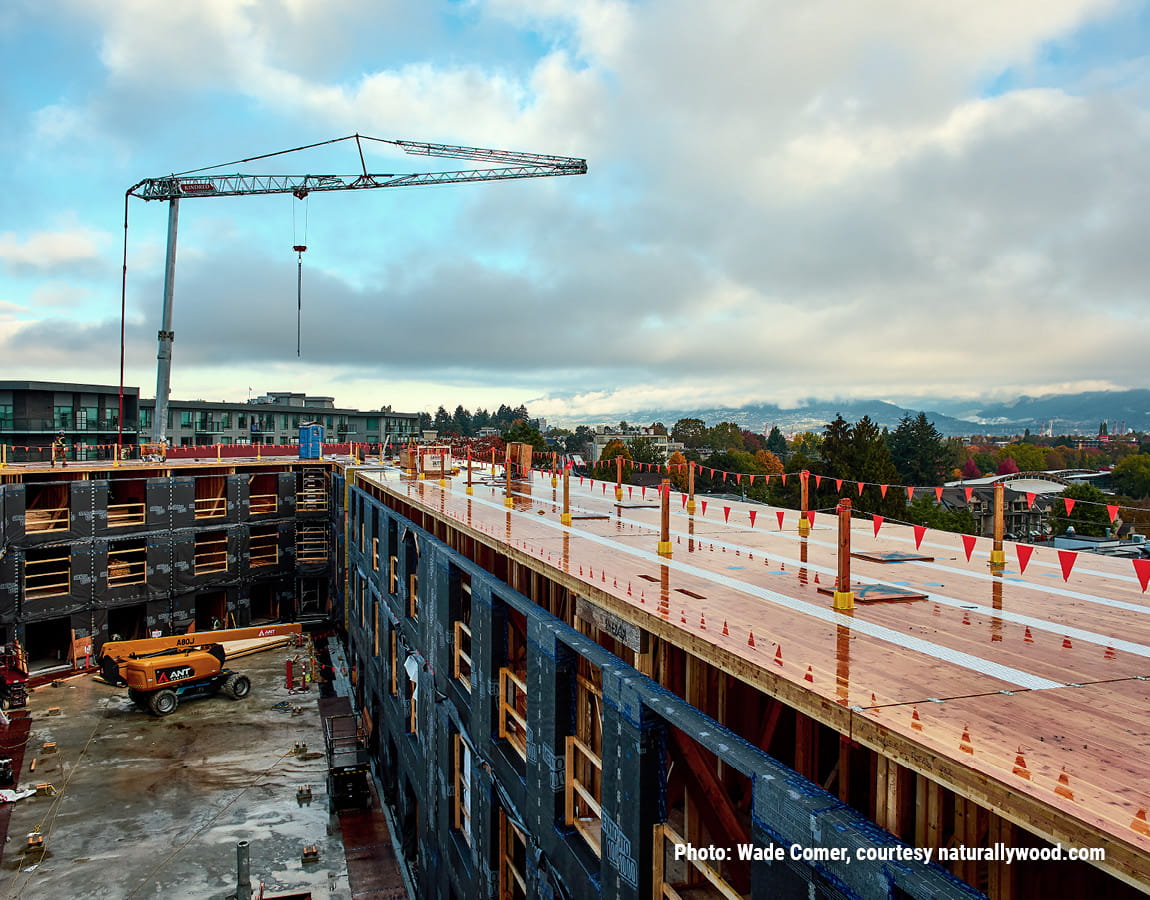 Vienna House is a seven-storey, 123-unit affordable housing project in East Vancouver that demonstrates how mass timber and prefabrication can support high-performance, mid-rise residential construction. The building uses a hybrid structural system incorporating cross-laminated timber (CLT) floor and roof panels with prefabricated light-wood frame wall assemblies. Off-site fabrication enabled tighter quality control and efficient site sequencing, while supporting the project’s Passive House performance targets through integrated air and thermal barrier strategies.